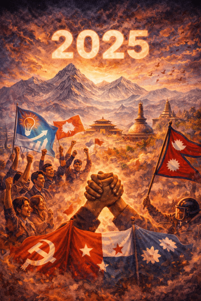 सन् २०२५ नेपाली राजनीतिमा तीव्र उतार–चढावको वर्षको रूपमा अंकित हुनेछ। यो वर्षको राजनीति कुनै एक घटना वा निर्णयबाट उत्पन्न नभई, धेरै तहका राजनीतिक, सामाजिक र प्रविधि क्षेत्रका विवादहरू ले एकैचोटि राष्ट्रिय ध्यान खिच्यो। यो वर्ष कुनै एक सरकारको उत्थान–पतन, कुनै एक आन्दोलनको सफलता–असफलता वा कुनै एक कानुनी निर्णयको प्रभावमा सीमित रहेन। बरु २०२५ एउटा यस्तो वर्ष बन्यो जहाँ राज्य, राजनीति र समाजबीचको सम्बन्ध नै पुनः प्रश्नांकित भयो। सत्ता कसका लागि हो? लोकतन्त्रको अर्थ केवल निर्वाचन हो कि सामाजिक न्याय पनि? कानुन शक्ति सन्तुलनको उपकरण हो वा जनअधिकारको सुरक्षा कवच? र सबैभन्दा महत्त्वपूर्ण युवापुस्ता अब राजनीतिमा दर्शक मात्रै रहनेछ कि निर्णायक शक्ति बन्नेछ? यी प्रश्नहरू कुनै दार्शनिक बहसमा सीमित रहेनन्। ती संसदमा, सडकमा, अदालतमा, सामाजिक सञ्जालमा र जनजीवनको दैनिक अनुभवमा प्रकट भए। वर्षको सुरुवातदेखि नै विविध राजनीतिक अस्थिरता, भ्रष्टाचार बारे बढ्दो आलोचना, संघीय र केन्द्रबीचको शक्ति सन्तुलनका विषयहरू र सबैभन्दा बढी युवा पुस्ताको उदय ले नेपाली राजनीति पुनः प्रश्नांकित गरायो। यही अर्थमा २०२५ लाई “पुरानो सत्ताको संकट र नयाँ जनआवाजको उदय” को वर्ष भन्न सकिन्छ। वर्षको अन्त्यसम्ममा सामाजिक आन्दोलन, सरकारको पतन, अन्तरिम सरकारको गठन र आगामी चुनावको समयरेखा तय जस्ता गतिशील राजनीतिक घटनाहरूले नेपालको राजनीतिक संरचनामा गहिरो प्रभाव पारेका छन्।